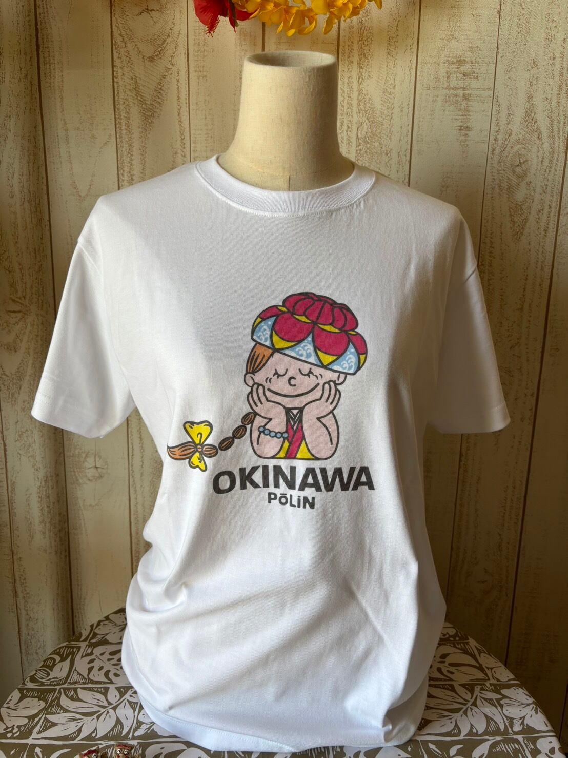 沖縄の数々のシンボルのイラストと、沖縄に行きたいな❤︎と夢見るポーリーンちゃんがデザインされた大人可愛いTシャツです♡♡
